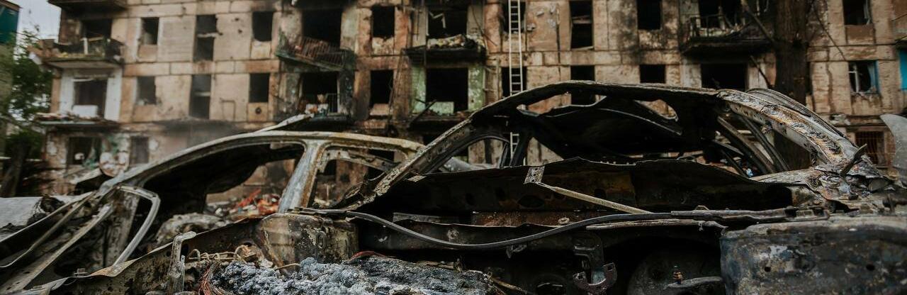 Житловий квартал Кривого Рогу після ворожої ракетної атаки. Обгоріла багатоповерхівка без вікон й дверей, поряд понівечені будинки, побиті автівки. Всюди гуркіт комунальної техніки і дзенькіт битого скла.