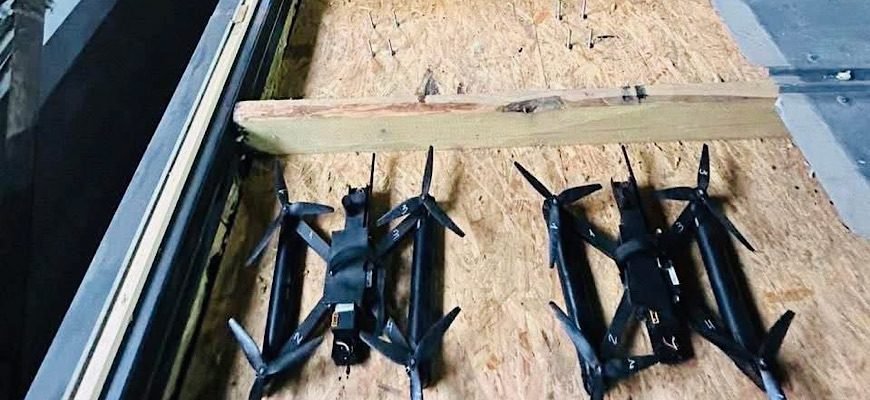 Колаж із фурою, яка везе дерев’яну будку, а в середині видно дрон. Підпис: