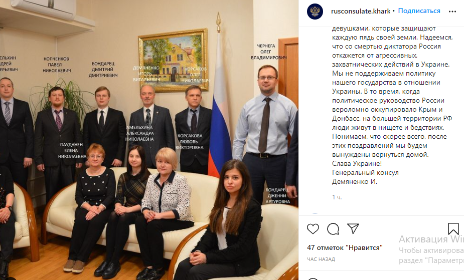 «Желаем вам богатырского здоровья, безупречной выдержки, тепла, радости, мирного неба над головой. Пребывая на священной украинской земле, мы осознаем низость политики Российской Федерации. Мы восхищаемся украинскими парнями и девушками, которые защищают каждую пядь своей земли. Надеемся, что со смертью диктатора Россия откажется от агрессивных, захватнических действий в Украине. Мы не поддерживаем политику нашего государства в отношении Украины. В то время, когда политическое руководство России вероломно оккупировало Крым и Донбасс, на большей территории РФ люди живут в нищете и бедствиях. Понимаем, что, скорее всего, после этих поздравлений мы будем вынуждены вернуться домой. Слава Украине! Генеральный консул, И. Демьяненко», — написано в сообщении.