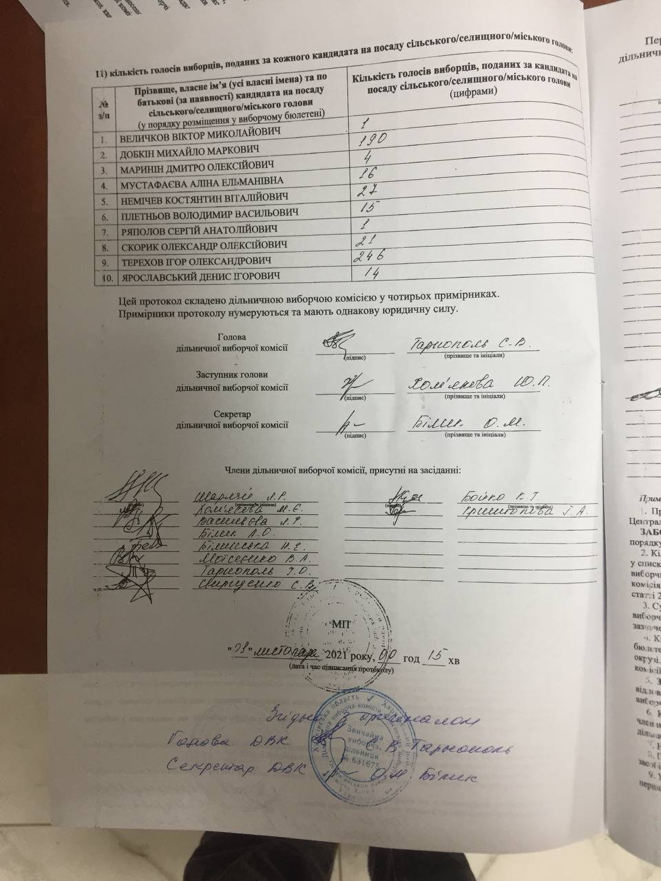 Так, в протоколе, который получил во время заседания на участковой избирательной комиссии наблюдательница «Опоры», голоса распределились следующим образом: Величков — 1, Добкин — 190, Маринин — 4, Мустафаева — 16, Немичев — 27, Плетнев — 15, Ряполов — 1, Скорик — 21, Терехов — 246, Ярославский — 14. А во время заседания Основянской районной комиссии представитель участковой комиссии объявил другие цифры, где уже было +70 голосов в пользу кандидата Игоря Терехова.