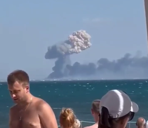 Люди намагаються виїхати звідти після серії вибухів. На околицях села утворилися пробки, пляжі спорожніли. З боку Євпаторії прямують колони машин екстрених служб.