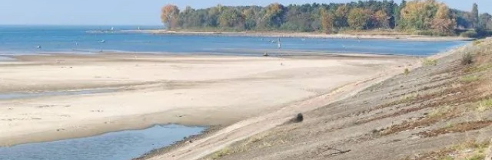 У Київському водосховищі помітили різке зниження рівня води. Користувачі соцмереж повідомляють, що вода впала приблизно на два метри, що призвело до утворення нових мілин та значного збільшення площі існуючих островів.