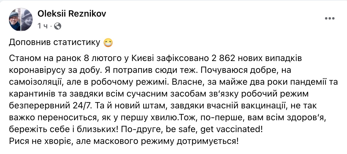 «Дополнил статистику. По состоянию на утро 8 февраля в Киеве зафиксировано 2862 новых случая коронавируса в сутки. Я тоже попал сюда. Чувствую себя хорошо, на самоизоляции, но в рабочем режиме», – написал министр обороны.