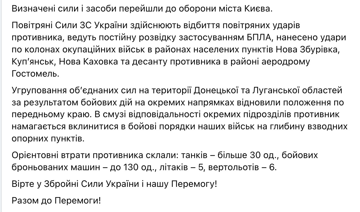 Воздушные силы ВСУ осуществляют отражение воздушных ударов противника, ведут постоянную разведку применением БПЛА, нанесены удары по колоннам оккупационных войск в районах населенных пунктов Новая Збуровка, Купянск, Новая Каховка и десанту противника в районе аэродрома Гостомель.
