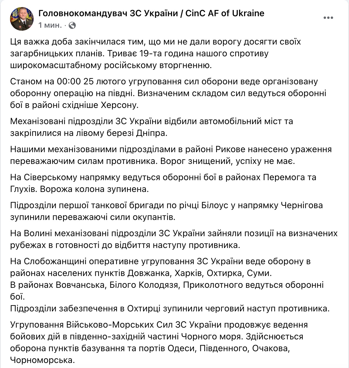 Главнокомандующий ВСУ дал сводку военных действий по состоянию на 00:00 25 февраля.