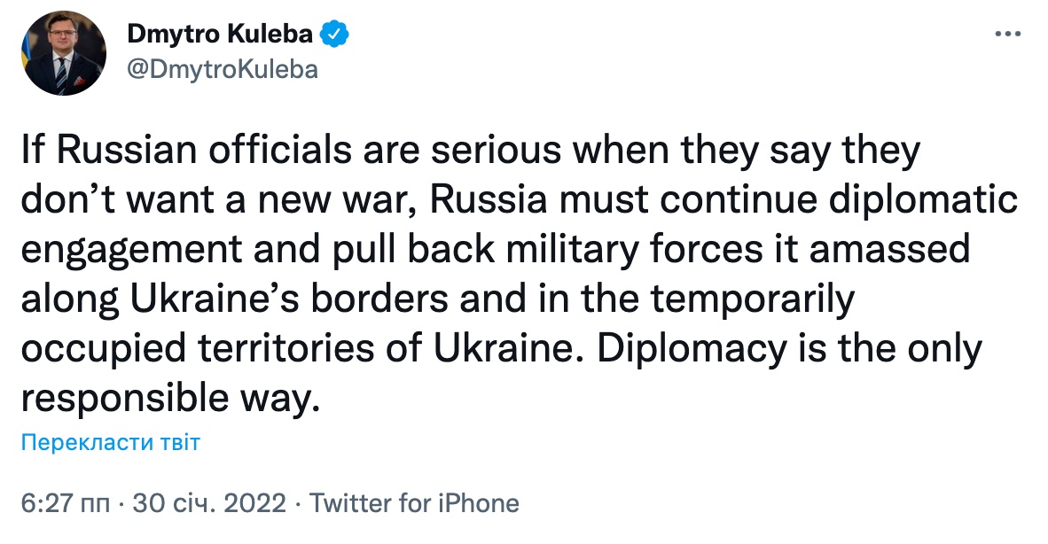 «Если российские официальные лица серьезно заявляют, что не хотят новой войны, Россия должна продолжить дипломатическое взаимодействие и вывести вооруженные силы, которые она сосредоточила вдоль границ Украины и на временно оккупированных территориях Украины», – написал Кулеба и добавил, что единственным ответственным путем в разрешении конфликтов является дипломатия.