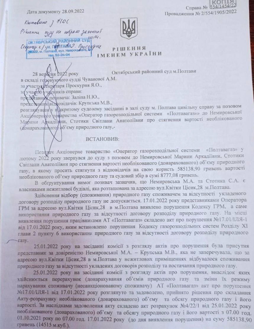 Участь Немировського в схемах пов’язаними з публічними закупівлями, звісно, дає йому можливість жити досить безбідним життям. Та попри своє безбідне життя члени його родини фактично дозволяли собі красти природний газ, що видно з відповідного рішення суду. За що і були нараховані більше ніж в пів мільйона гривень борги. Тобто, питання різного роду схем для друзів Еренбурга дуже близьке. Що відповідно вказує на моральні якості. Оскільки, навіть пенсіонери в такий скрутний для країни час намагаються сплачувати комунальні послуги зі своїх копійчаних пенсій. Але ж ніяк не займаються їх крадіжками.
