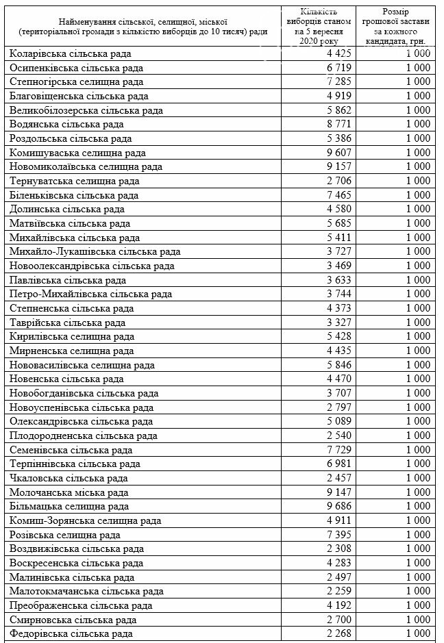 Далее в таблицах публикуем размеры залога для кандидатов в городские, поселковые и сельские советы в Запорожской области.