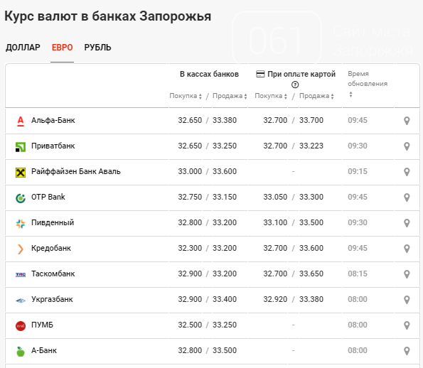 В банках Запорожья курс доллара установили в пределах 27,750 — 28,250 гривен. Курс евро составил 32,650 — 33,600 гривен.