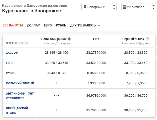 В банках Запорожья курс доллара установили в пределах 28,165 — 28,400 гривен. Курс евро составил 33,220 — 33,640 гривен.