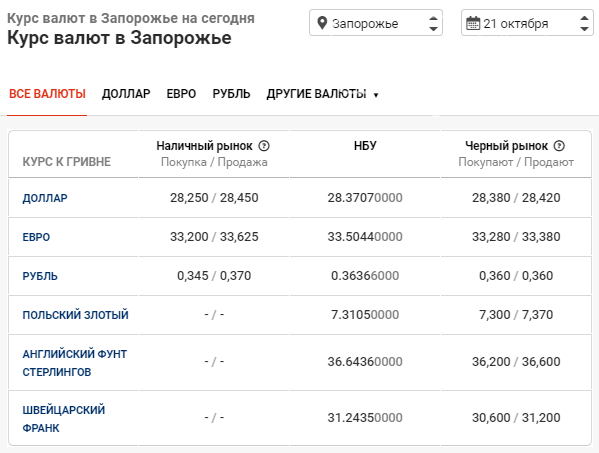 В банках Запорожья курс доллара установили в пределах 28,250 — 28,450 гривен. Курс евро составил 33,200 — 33,625 гривен.