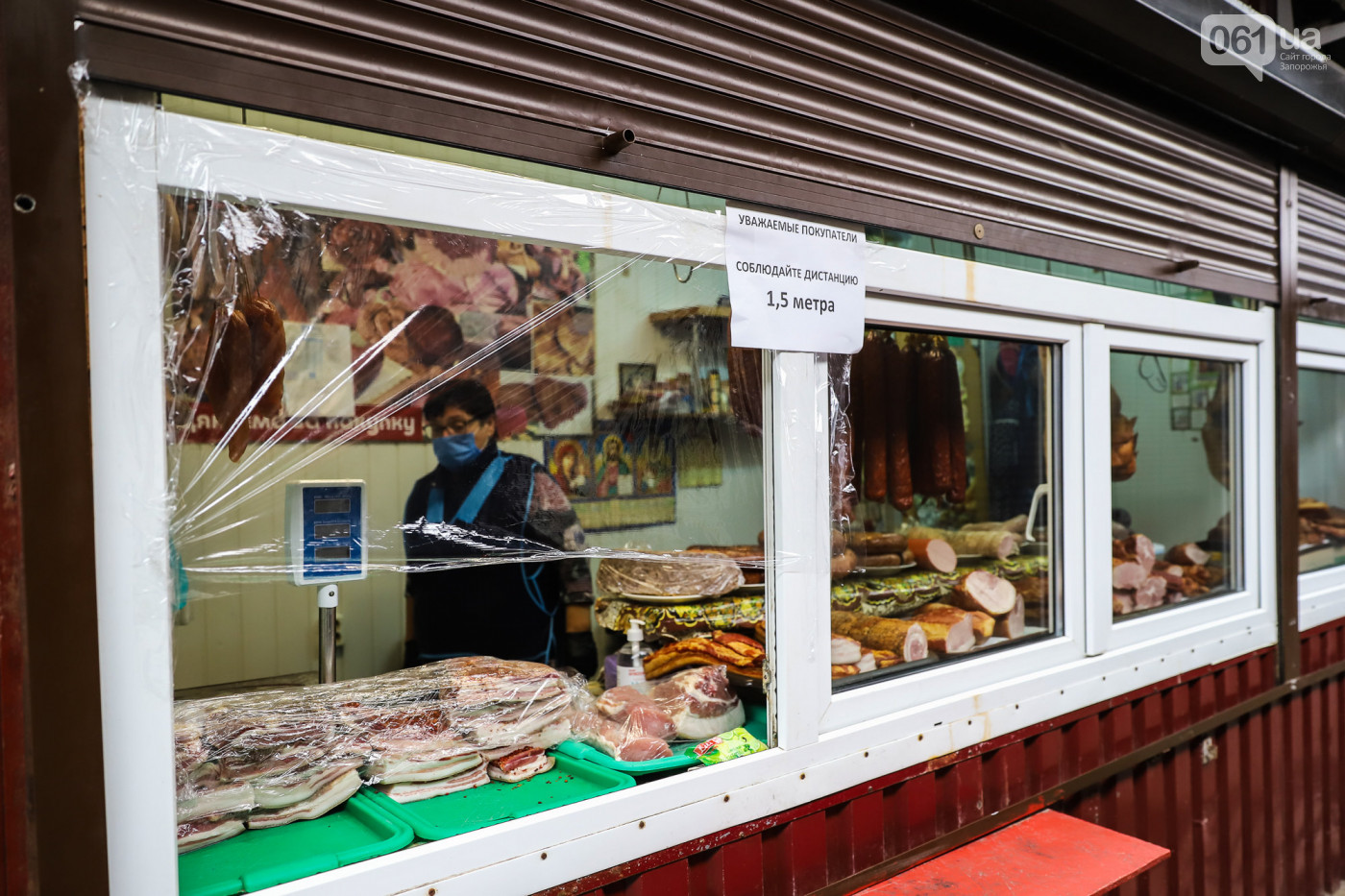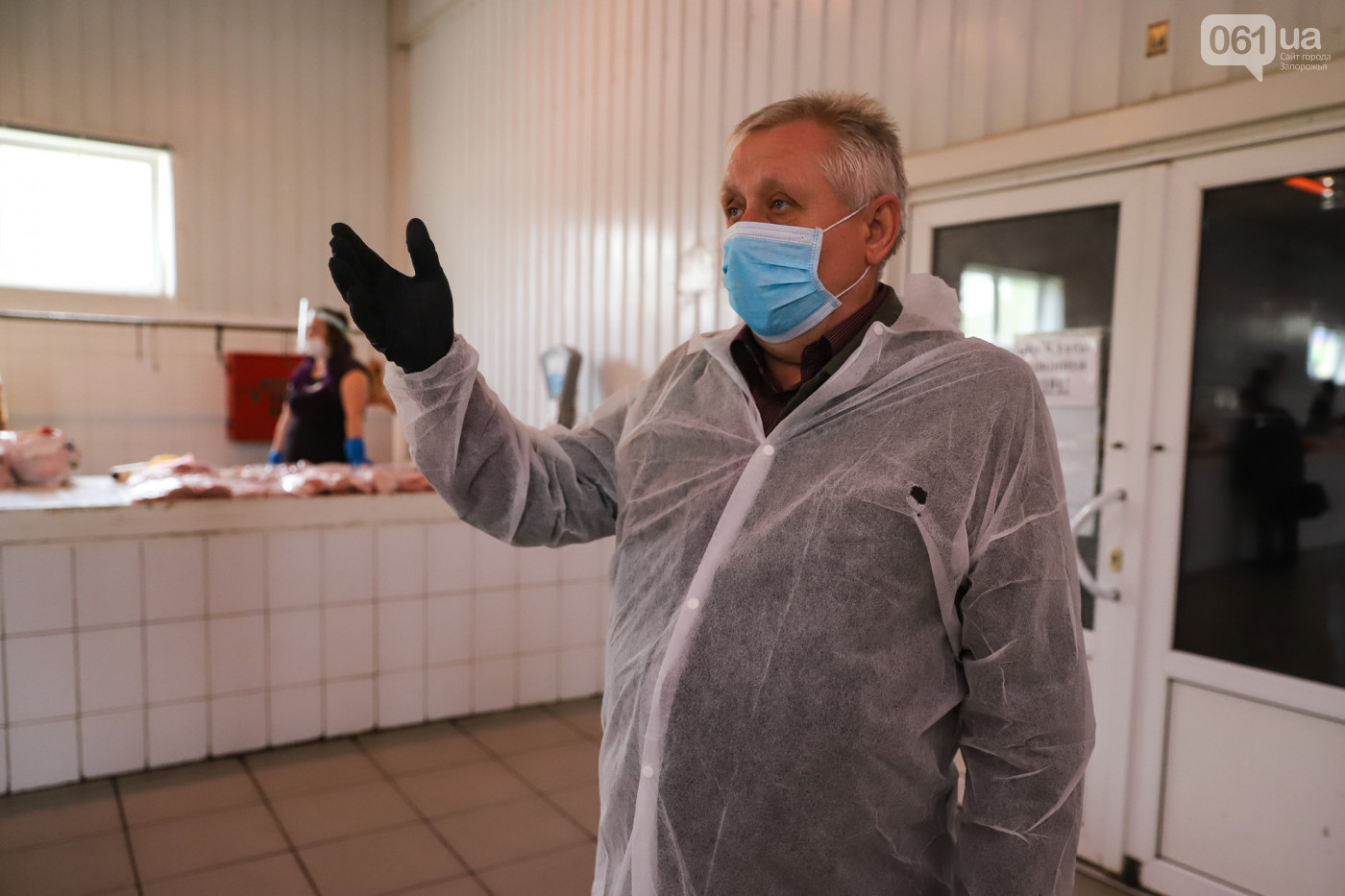 — На сьогодні ми подивились – основні вимоги виконані, тобто на вході є маркування і покупці можуть дотримуватись дистанції. Проводиться температурний скринінг людей, які приходять на ринок, і продавців, що працюють. Є дезинфікуючі речовини, які використовуються на вході в ринок і при прибиранні. Ви бачите – захисною плівкою мясо закрито, продавці в захисних масках і екранах, в рукавичках, у всіх є антисептик – дезінфекція рук проводиться. Кожні три години проводиться дезінфекція поверхонь, з якими контактують харчові продукти, покупці. Ми будемо працювати кожний день, приходити зранку і до кінця роботи ринку слідкувати за дотриманням діючих вимог, — сообщил начальник отдела Госпродпотребслужбы Запорожского района Геннадий Зверев.
