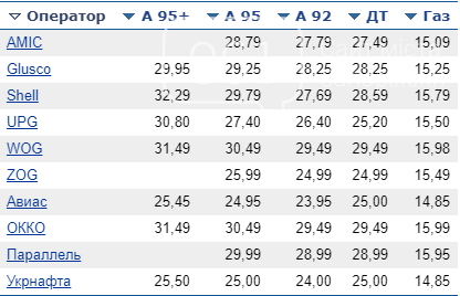 Что касается операторов АЗС и их цены на топливо (грн/литр):
