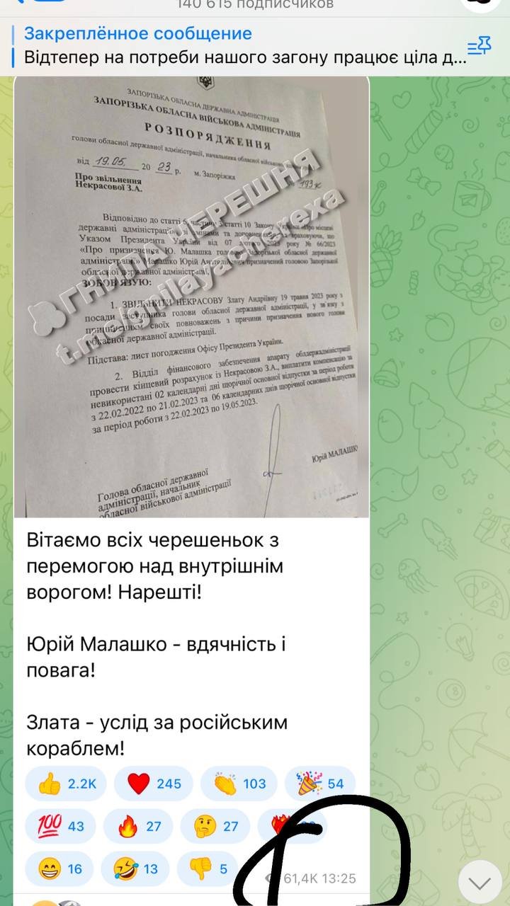«Юрій Малашко вже на посаді понад 100 днів, і чого саме зараз він наважився на подібне розпорядження? Може після початку моїх активних дій щодо висвітлення реальних обставин з розкрадання гуманітарної допомоги?… До сьогодні, голова ЗОВА — Юрій Малашко, жодного разу не прокоментував та не вчинив жодних дій щодо ситуації навколо розкрадання гуманітарної допомоги під час війни у Запорізькій області», — написала вона.