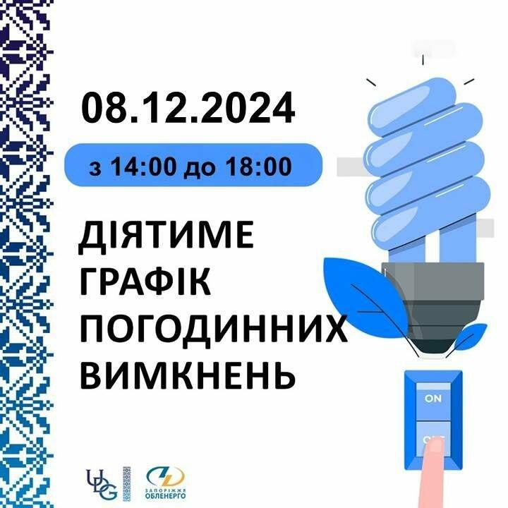 Завтра, 08 грудня, по Запорізькій області з 14:00 до 18:00 продовжують діяти графіки погодинних відключень.