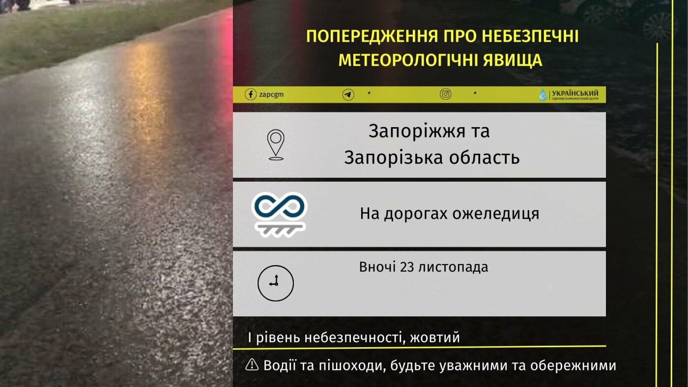 Вночі 23 листопада в Запоріжжі та Запорізькій області очікується ожеледиця на дорогах, I рівень небезпечності.