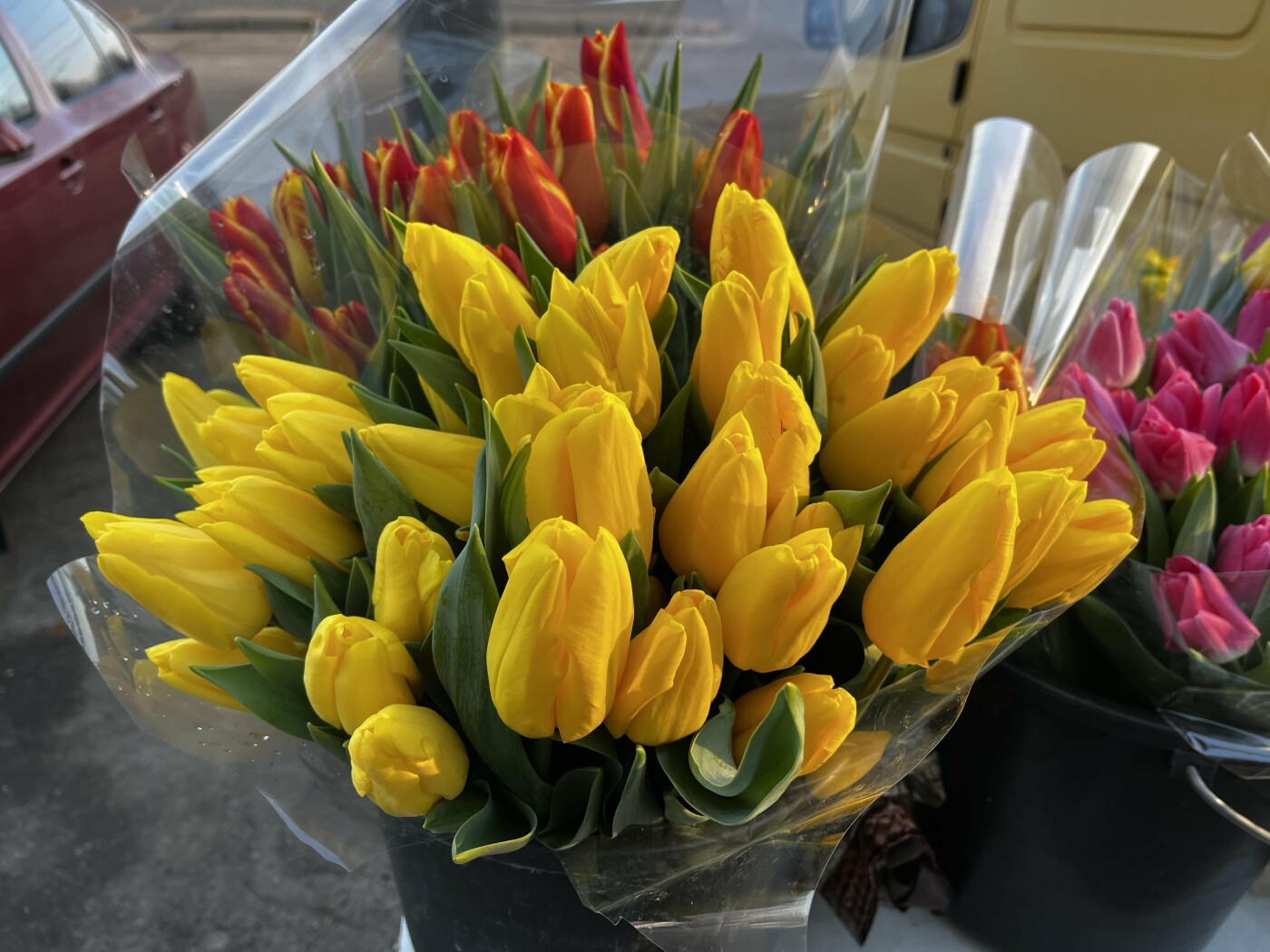 В місті вже з 6-ї годинку ранку можна купити першоцвіти в горщиках та букети тюльпанів.